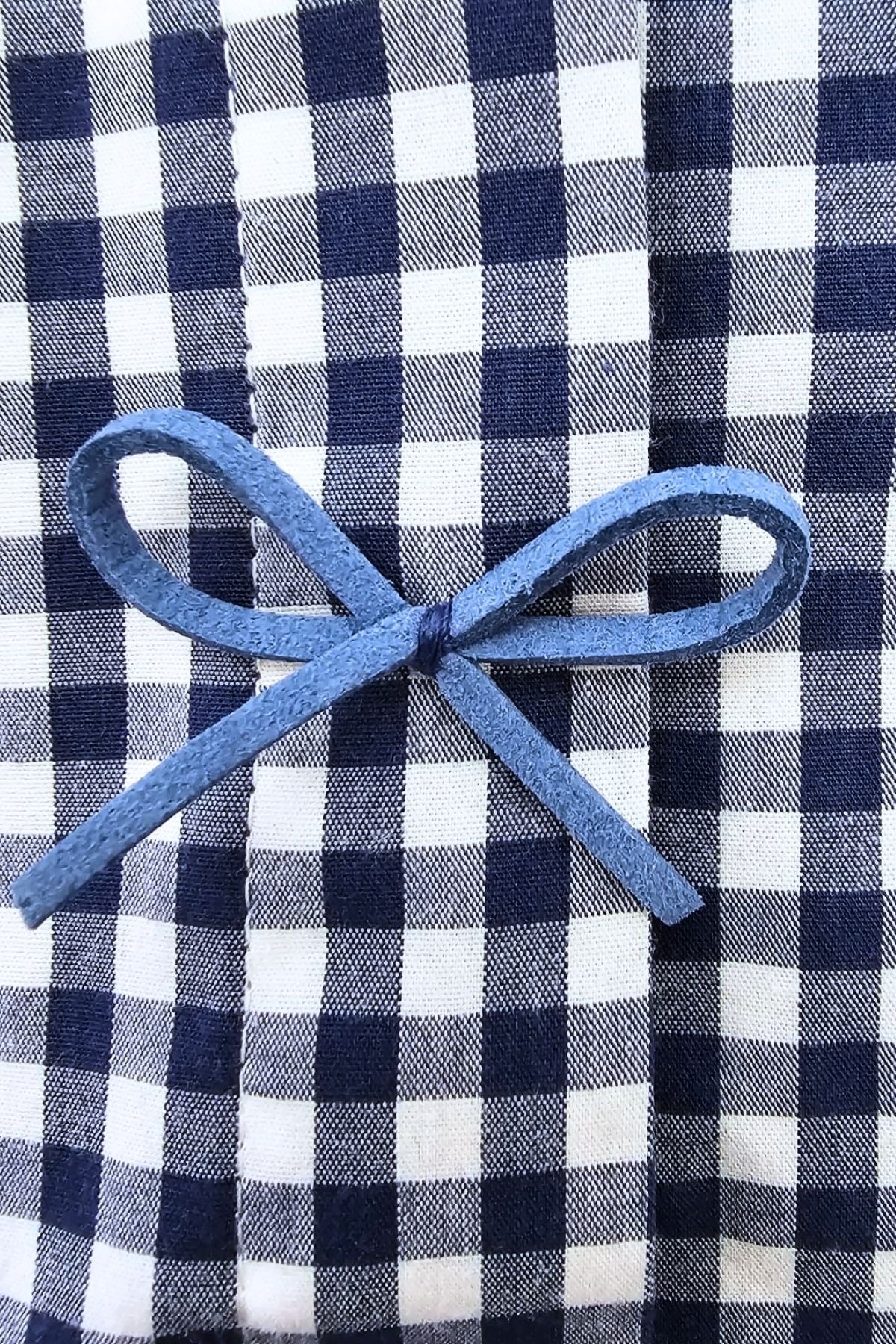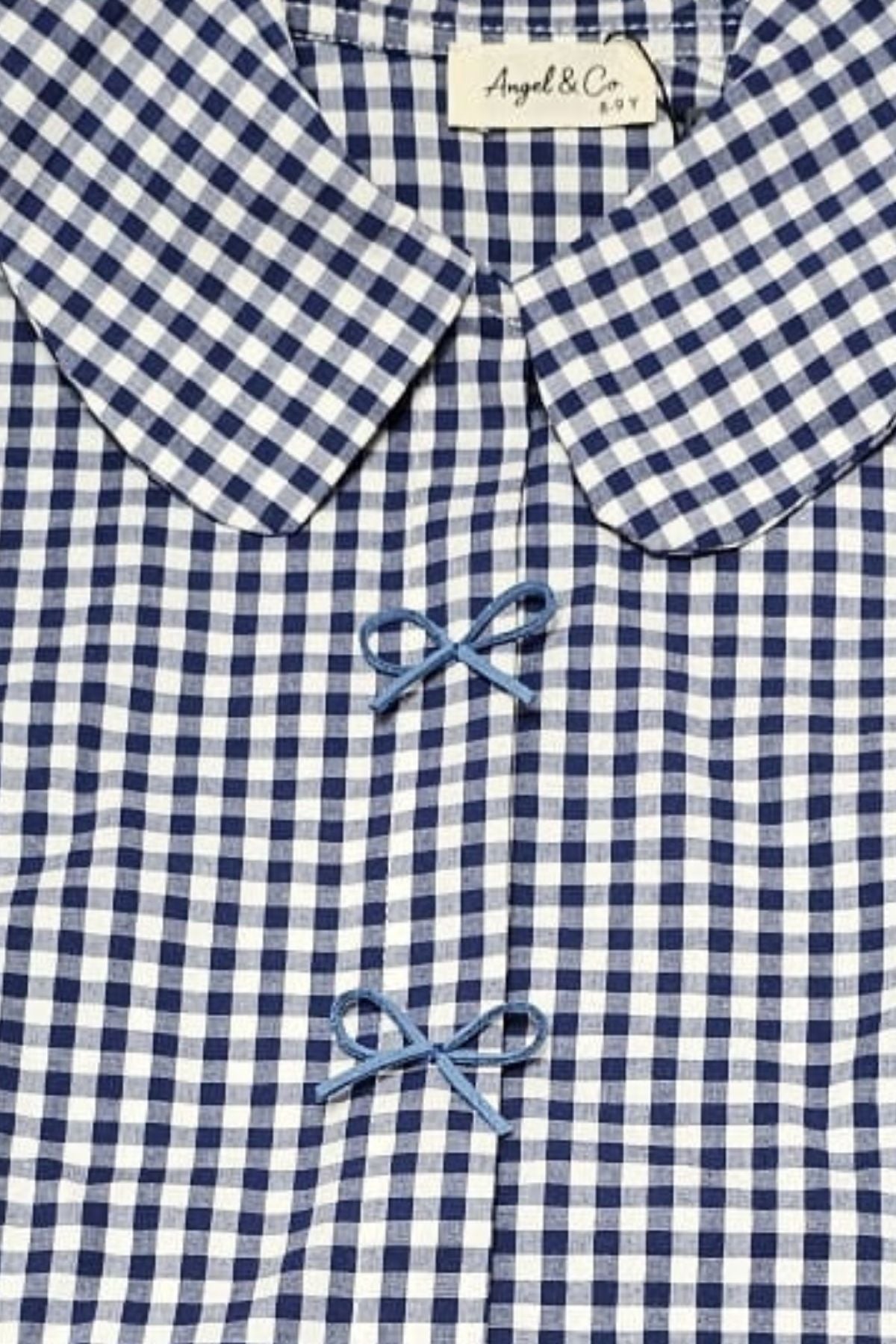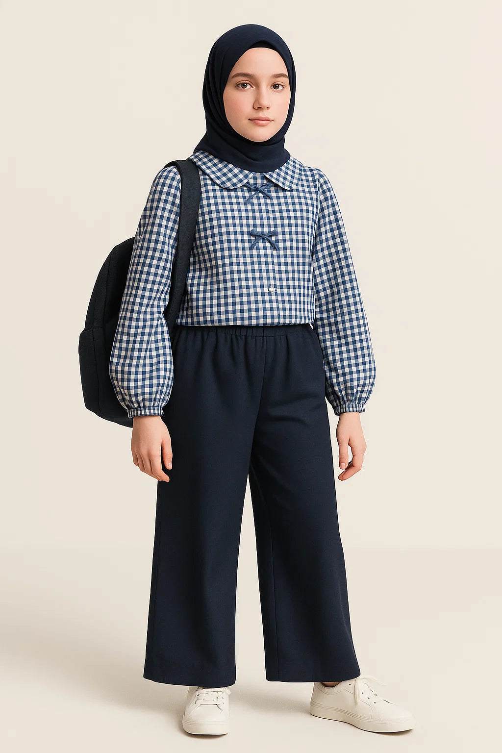 %100 pamuk kumaş: Nefes alır, terletmez, hassas ciltlere uygundur.; Mavi-beyaz pötikare desen: Zamansız ve çocuklara özel neşeli bir görünüm sunar.; Peter Pan yaka: Tatlı ve klasik bir yaka detayıyla fark yaratır.; Gizli pat tasarım: Düğmeler gizlenmiştir, sade ve düzenli bir ön görünüm sağlar.; Uzun kollu ve bilek lastikli: Çocukların rahat hareket etmesi için esneklik sunar.;Lacivert pileli bol paça pantolon, rahat lastikli beli ile gün boyu konfor sunar.