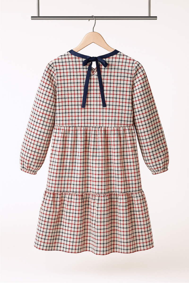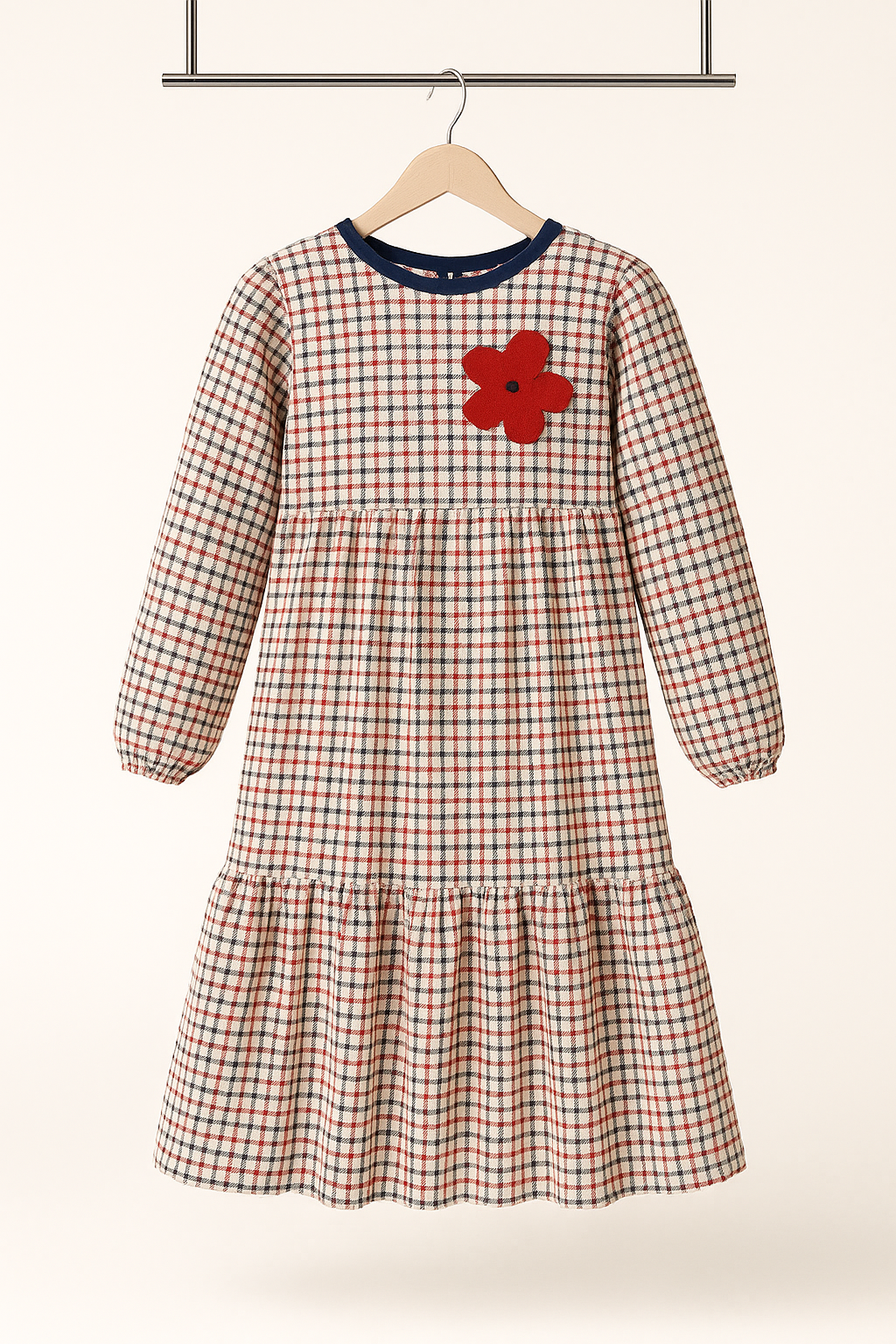 %100 pamuk kumaş ekose kumaştan üretilen bu uzun kollu elbise, robadan kesimi ve çift kat büzgülü eteğiyle hem şık hem rahat bir görünüm sunar. Bahar ve yaz aylarında kullanıma uygundur. Angel&Co. kalitesiyle çocuklarınız için zarif ve konforlu bir tercih.